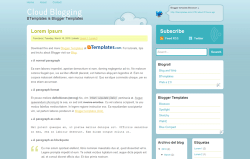 Collaborative designs and Blogger template conversions distributed through the mammoth Blogger template directory, BTemplates.com.87. Cloud Blogging